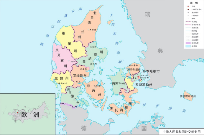 デンマーク王国(デンマーク語:Kongeriget Danmark、英語:The Kingdom of Denmark)は、略称デンマークとも呼ばれ、首都をコペンハーゲンに置き、北ヨーロッパに位置しています。南はドイツ、西は北海、北はノルウェーとスウェーデンと国境を接しています。温暖な海洋性気候で、地形は低地であり、天然資源は少なく、石油と天然ガス以外の鉱床はほとんどありません。総面積は43,096平方キロメートル(グリーンランドとフェロー諸島を除く)、海岸線は7,314キロメートルです。デンマークは5つの地域、98の自治体、そして2つの自治領(グリーンランドとフェロー諸島)で構成されています。2023年12月現在、デンマークの総人口は594万6千人で、その大部分はデンマーク人で、そのほとんどがキリスト教徒です。
